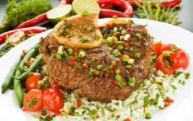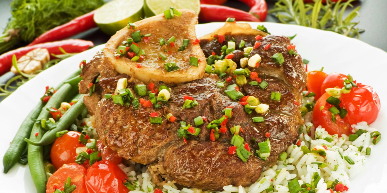 Стейк особуко по-італійськи — це традиційний різновид страв із телятини, у якому гомілкову кістку з м’ясом тушкують кілька годин. У результаті яловичий стейк виходить м'який та огорнутий густий соусом. Так італійську страву зручно подавати з гарніром.