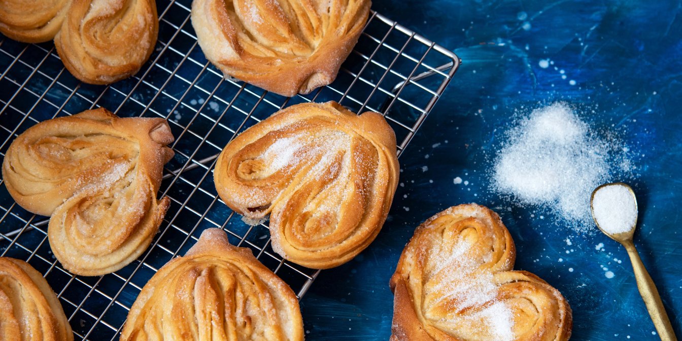 Розкачай кульку в коло, змасти маслом, посип цукром. Скрути в трубочку, зʼєднай кінці та зроби надріз з іншої сторони, розгорни серце. Виклади на деко з пергаментом.