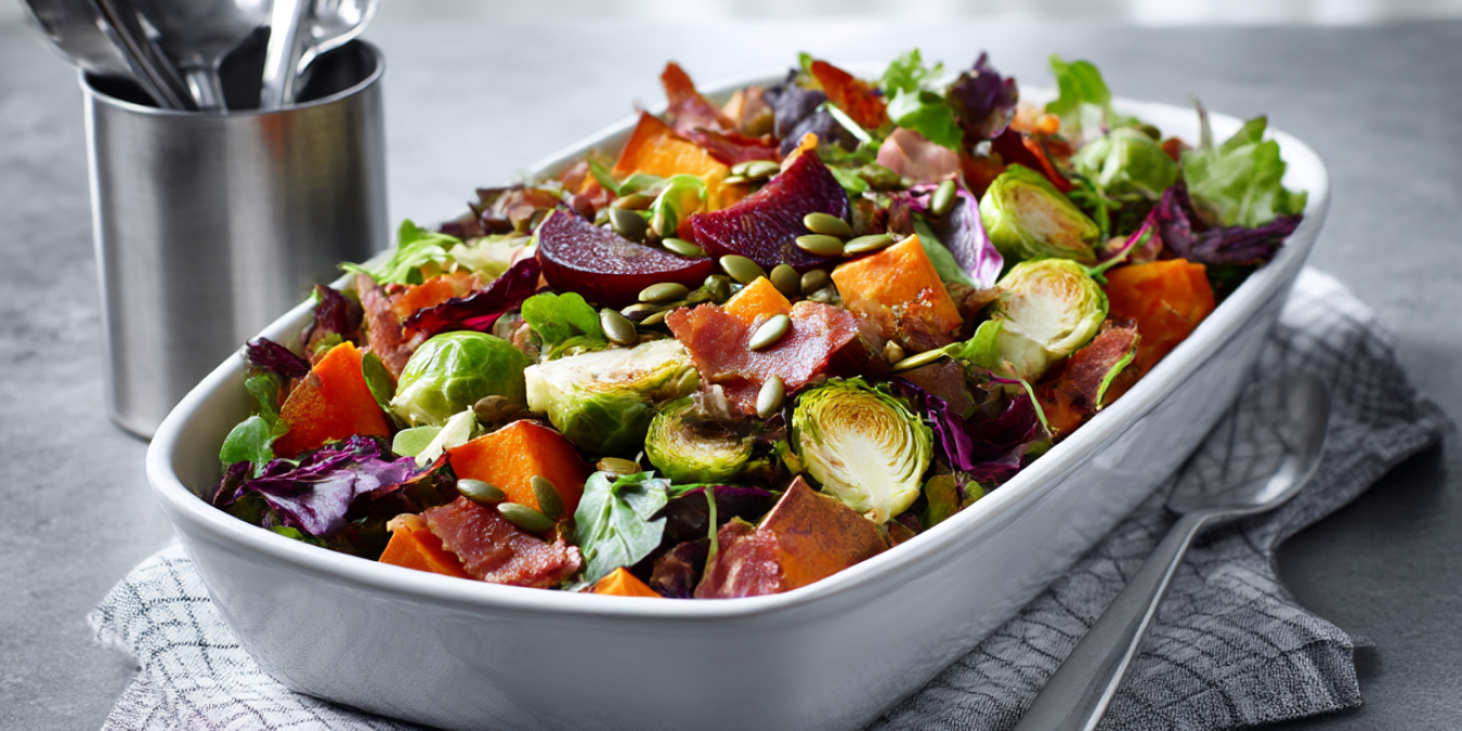 Теплий салат з панчетою, бататом і брюссельською капустою — ситна страва для осені