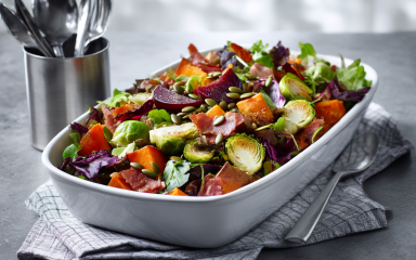 Теплий салат з панчетою, бататом і брюссельською капустою поєднує сезонні овочі й солону хрустку панчетту. Такий рецепт теплого салату із панчетою урізноманітнить осіннє меню, адже він ситний, поживний і водночас легкий для засвоєння.