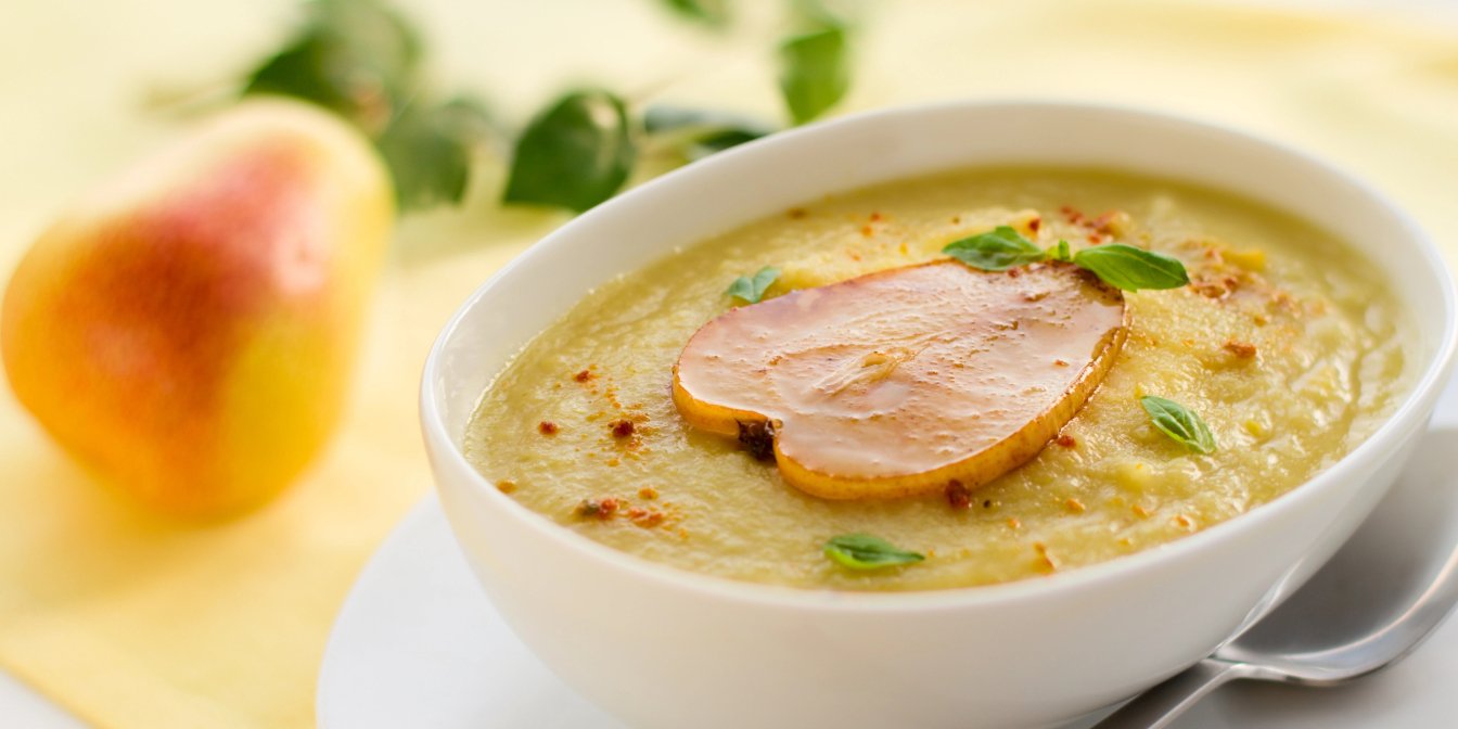 Рецепт супу із карамелізованою цибулею, грушею та горгонзолою