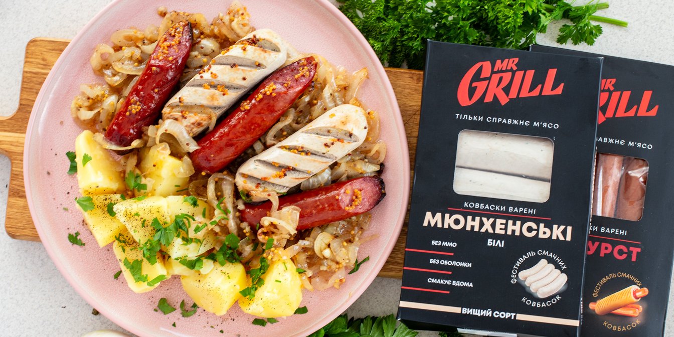 Запечи ковбаски з ароматною цибулею, медово-гірчичним соусом і спеціями, щоб отримати соковиту й рум’яну страву в найкращих німецьких традиціях. Мюнхенські білі ковбаски та копчені бірвурст — чудовий вибір для такої затишної страви.