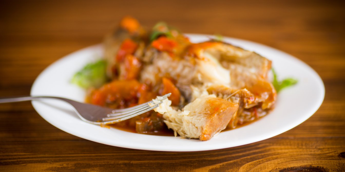 Додайте вершкове масло, сіль, перець, цукор і викладіть шматки риби. Залийте окропом і поставте тушкуватися на 2-3 години.