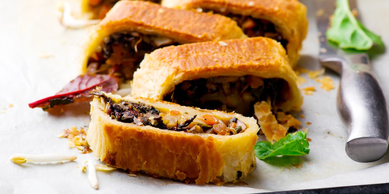 Цей рулет поєднує хрустку легкість філо та соковиту начинку зі свининою, яблуками й шавлією. Приготуй ще: