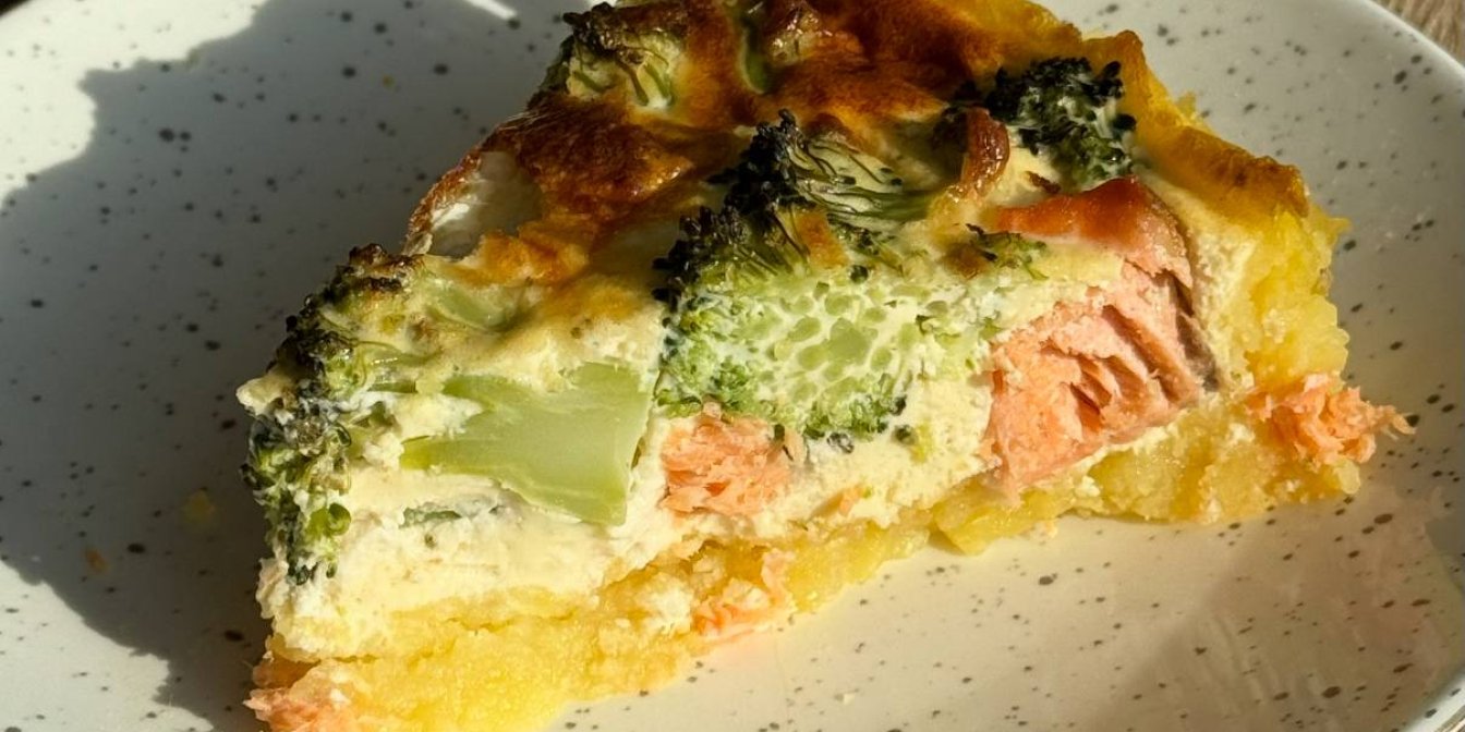Рецепт буде без борошна, а отримаємо одну із ситних страв з картоплі. Основа картопляного пирога з рибою та броколі — картопляне пюре. Перед випіканням заливаємо начинку сумішшю зі сметани, яєць і тертого сиру.