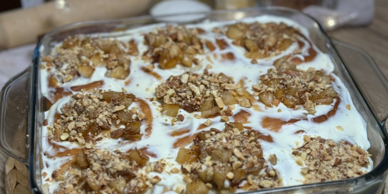 Ці сінабони з яблуками поєднують класичну основу з м’якого дріжджового тіста та два типи начинки: вершково-коричну і фруктову. Яблука попередньо тушкуються на маслі з цукром і корицею — це дає карамельну глибину смаку. Після випікання булочки поливаються вершковим кремом, який робить їх ніжними навіть після охолодження.