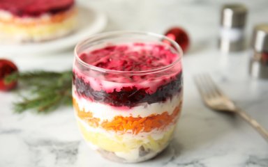 - Формуй салат в одній салатниці, як це передбачають усі рецепти шуби, або рівномірно розділи інгредієнти і зроби шубу в креманках.