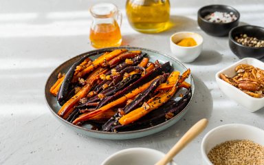 - Соус на основі веганського йогурту, тахіні та лимонного соку додає кремовості та збалансовує карамельну моркву.