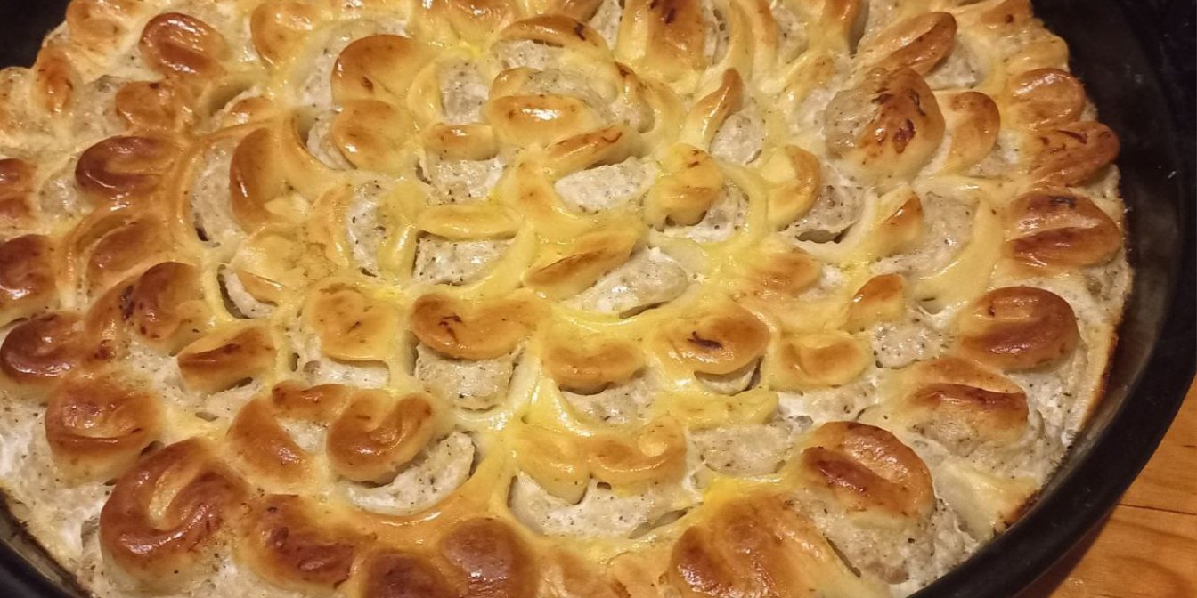 Цей мʼясний пиріг одночасно простий у виконанні та вражаючий зовні. Завдяки особливому способу формування — з маленьких пелюсток із фаршем — страва нагадує об’ємну квітку, яка після запікання розкривається в духовці. Тісто замішується на поєднанні теплого молока й кефіру, що дає м’якість і ніжну текстуру. Підходить для святкового столу, особливо якщо хочеш здивувати гостей чимось домашнім, але елегантним. Подавати пиріг найкраще теплим, коли аромат свіжої здоби поєднується з м’ясною начинкою — від цього важко втриматись.