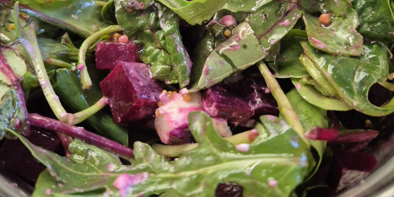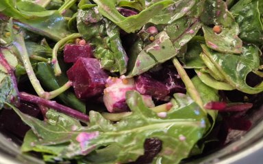 І ще один практично миттєвий рецепт салату з буряком. Заздалегідь звари два середніх буряка. Овочі поєднаємо із сиром інсалата (фетою) і міксом зелені. Рецепт отримали від читачки Валерії Сидоренко.