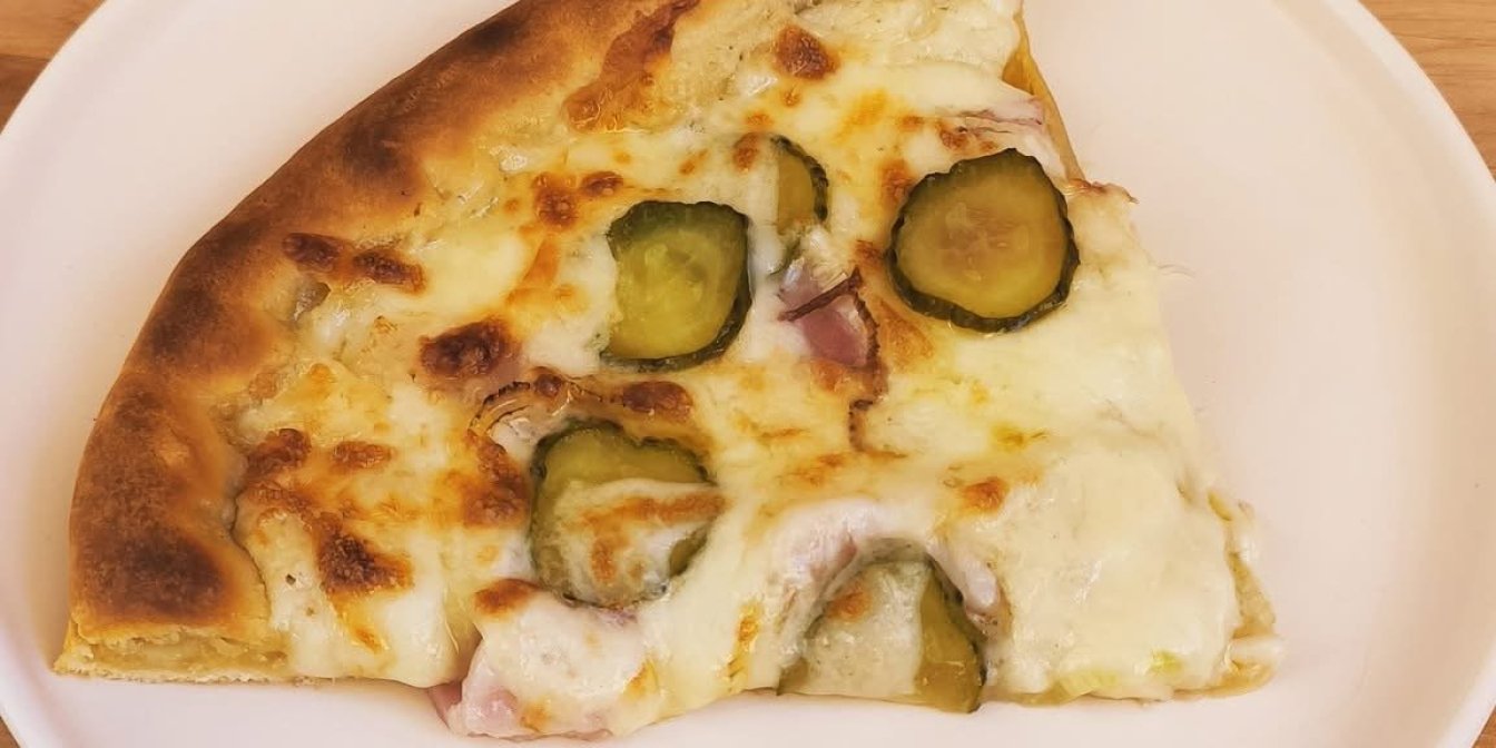 Ще один вдалий і доступний рецепт до нашого списку з домашніми піцами. Читачка Hanna замішує тісто на воді та сухих дріжджах, а для начинки, крім заявлених продуктів, потрібна моцарела. З цих інгредієнтів буде дві піци з часниковим соусом, беконом та маринованими огірками.