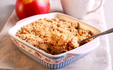 Цей дитячий варіант яблучного крамблу створений спеціально для маленьких любителів солодкого: без цукру, без тіста, без жодних алергенів. Усе, що треба, — яблуко, ложка пюре, щіпка кориці й вівсяна шапка, що стає золотистою під час запікання. У результаті маємо десерт, який пахне дитинством і готується швидко. Його можна заморозити, взяти з собою або подати теплим.