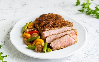 Така скоринка не лише додає ніжному м’ясу приємного контрасту текстур, а й розкриває його смак у новий спосіб — з легкою горіховістю гречки, свіжістю зелені та пікантною ноткою часнику.
