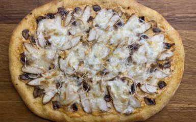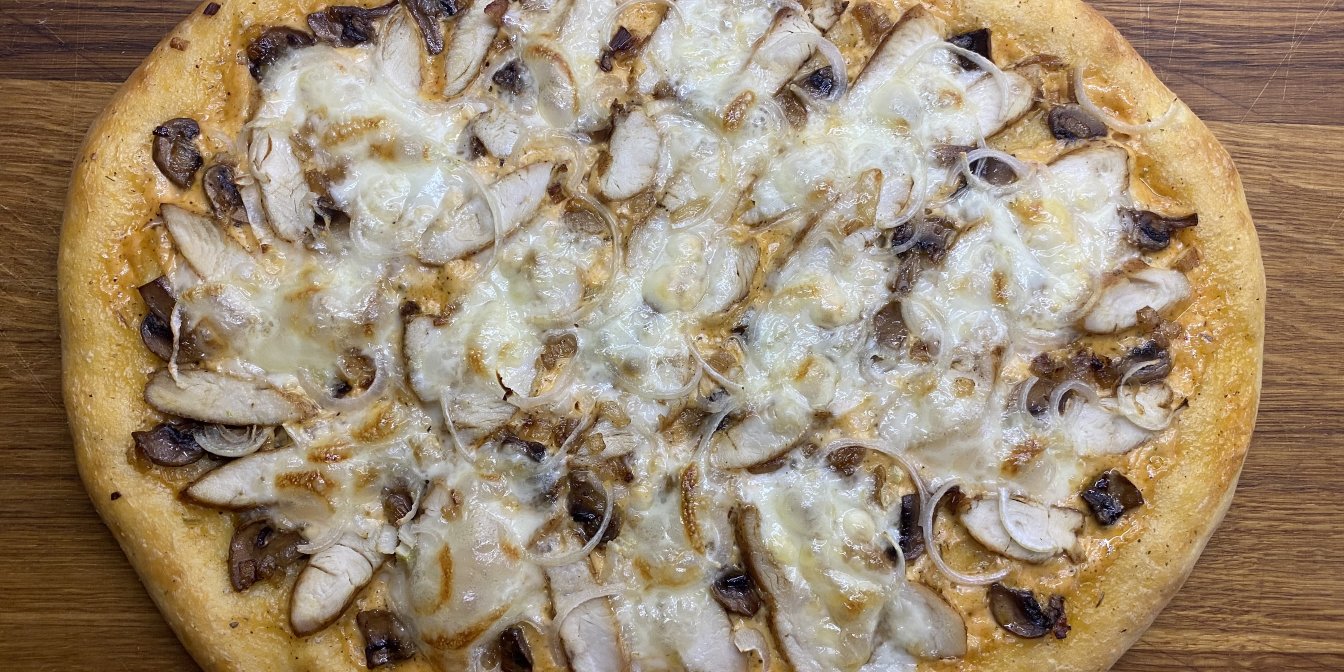 Піца з куркою, печерицями, цибулею та моцарелою — рецепт з тістом на сухих дріжджах
