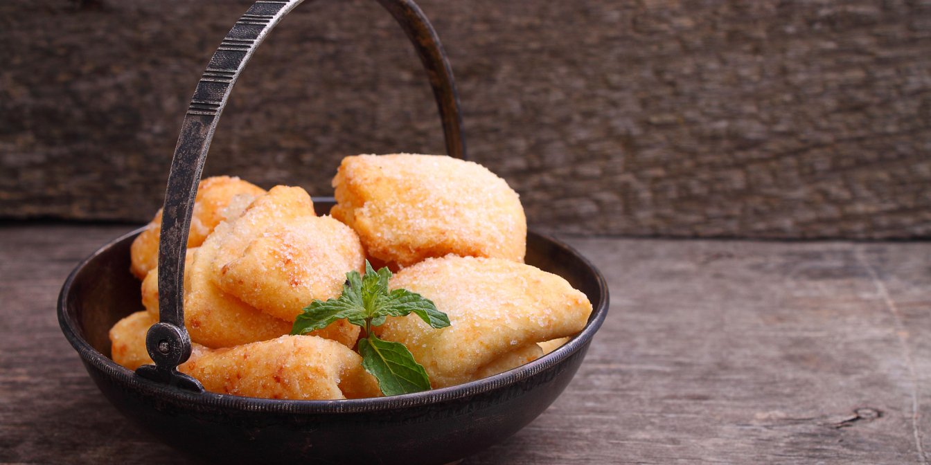 У мисці змішайте цукор і корицю. По черзі опускайте кружечки з тіста у цукор, складіть навпіл цукром в середину, опустіть у цукор ще раз і знову складіть навпіл цукром всередині. У вас вийде трикутник, знову опустіть його в цукор однією стороною, а чистою стороною донизу викладіть на деко.
