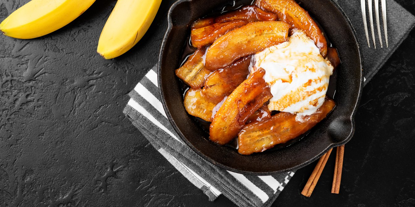 Банани Фостер гарно поєднується з морозивом та збитими вершками. Солодкі фрукти в карамелі з ноткою рому — ви захочете готувати цей десерт знову і знову!