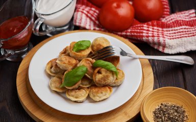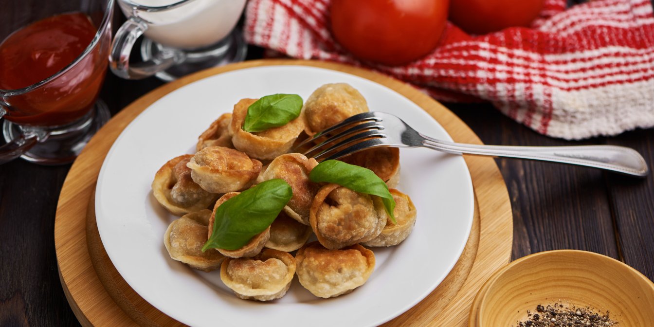 SHUBA пропонує спробувати цю страву і вам! Ми публікуємо повний рецепт включно із готуванням домашніх пельменів. Зверніть увагу, що смажити треба саме заморожений продукт — свіжі пельмені просто прилипнуть до сковорідки та позлипаються між собою. Тож перед тим, як готувати домашні пельмені, краще заморозьте їх на ніч або просто придбайте готові у магазині.