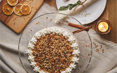 На спечений корж викладіть крем. Поставте в холодильник на 3 години. Перед подачею прикрасьте горіхами та печивом безе.