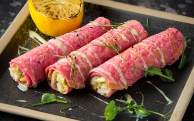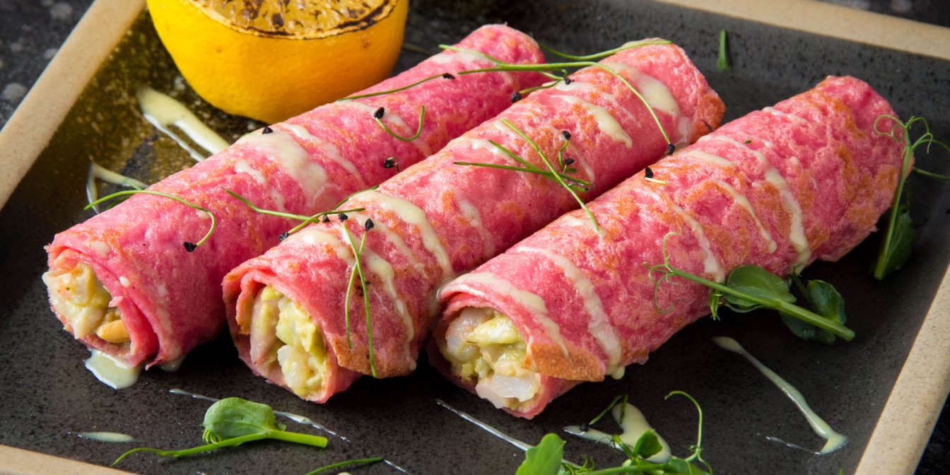 У цих млинцях прекрасно все: насичений рожевий колір, кремова начинка з авокадо, креветок і вершкового сиру, і густий білий соус. Ідеальна комбінація, коли хочеться вразити гостей і візуальним виглядом страви, і смаком, і подачею.