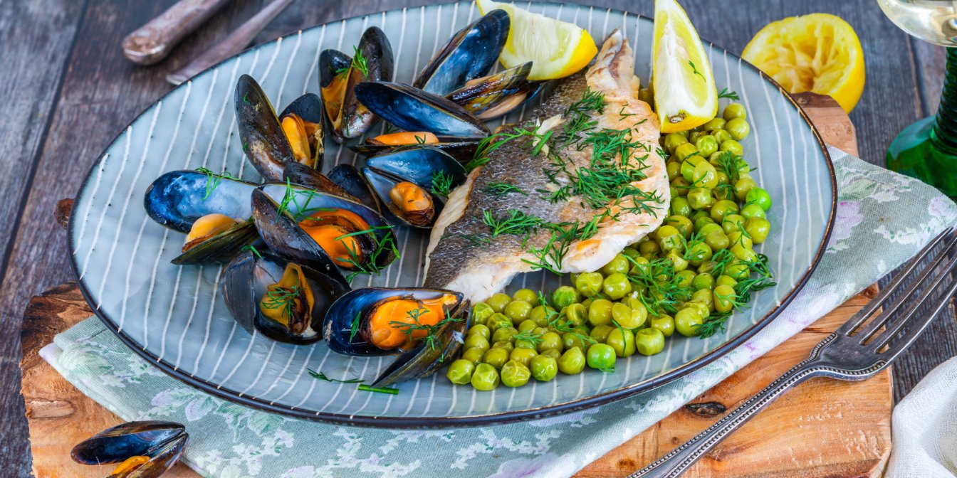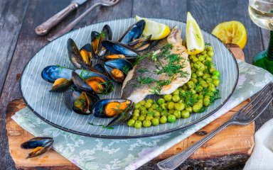 Літній салат із зеленим горошком чудово підходить до морепродуктів, відварної або запеченої риби.