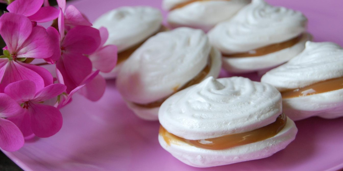 Меренги, або безе, — це спечені тістечка з яєчного білка та цукру. І хоч у складі найпростіші продукти, вони завжди виходять смачними. До того ж меренги універсальні — до них можна додавати горішки, ягоди, какао, мигдаль. У нас таким наповненням є карамель.