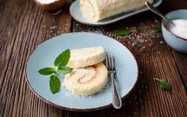 Для тіста яйця збийте зі 100 г цукру, водою і ванільним цукром. Додайте борошно, розтоплене вершкове масло, розпушувач і ще раз збийте до однорідності. Тісто вилийте на деко, застелене пергаментом, і випікайте 10 хвилин за температури 200°C. Потім обережно зніміть з пергаменту і загорніть рулетом.
