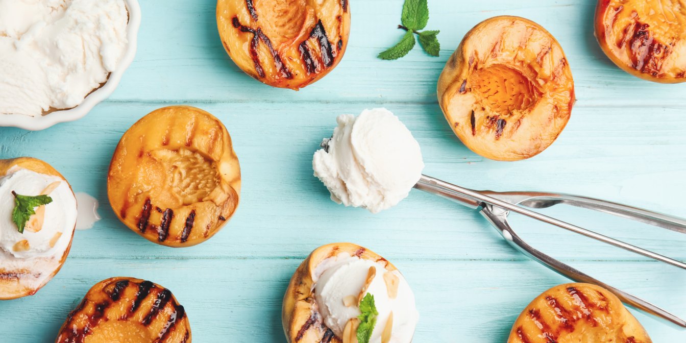 Подавайте персики на грилі як гарнір або в салатах. Або ж ви можете перетворити їх на чудовий десерт, поєднуючи їх з прохолодним йогуртом, збитими вершками або, як у нашому рецепті, з кульками морозива. Якщо вже кортить освіжитись, то тільки безалкогольним персиковим газозом.