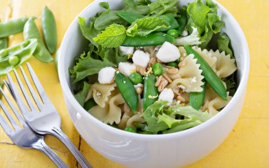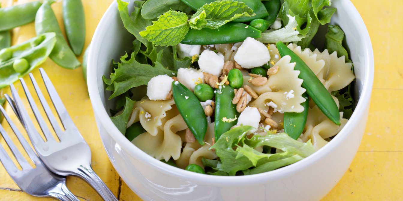 Легкий салат з макаронами, свіжим горошком, зеленню та фетою — це поживна і смачна їжа на кожен день.
