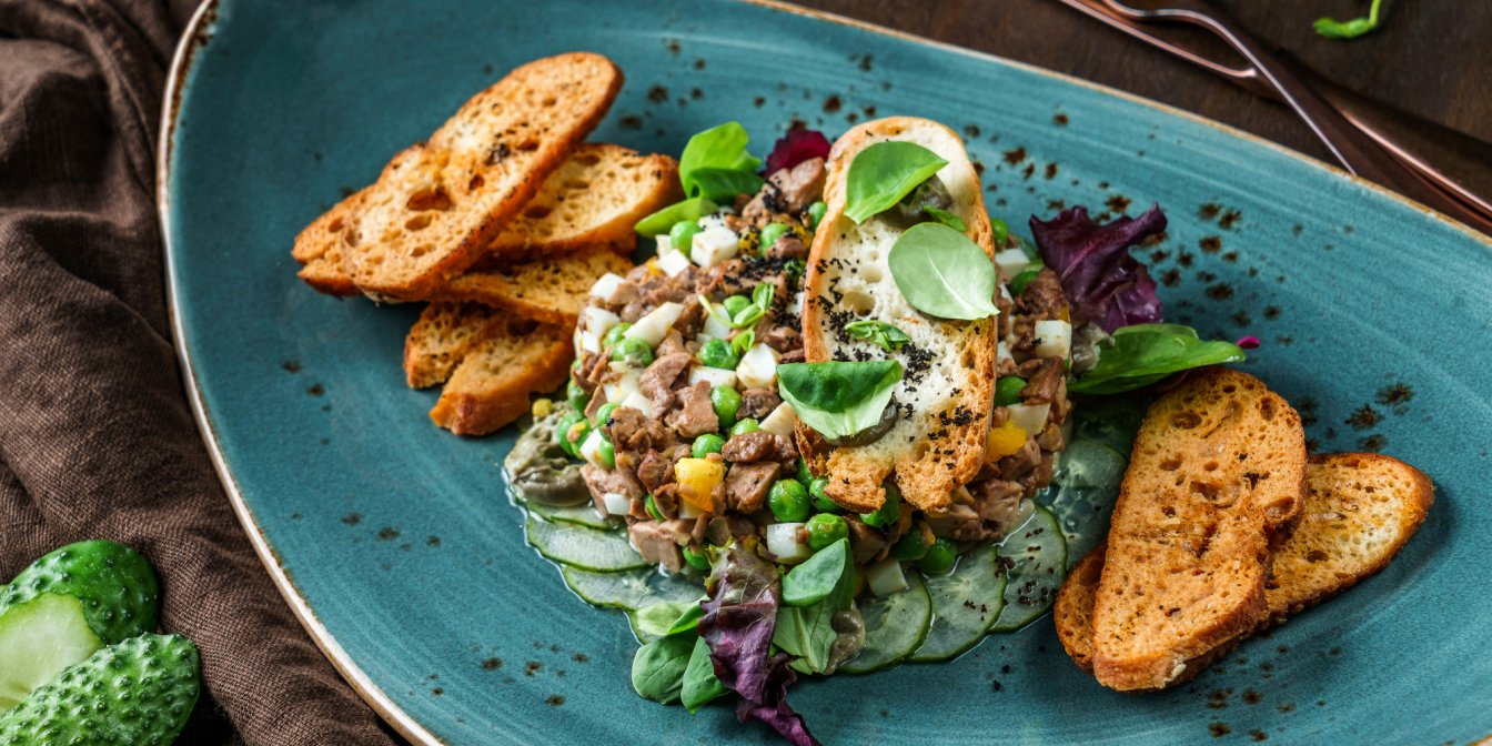За бажанням приготуйте до салату часникові грінки та подавайте елегантну вечерю з білим вином.