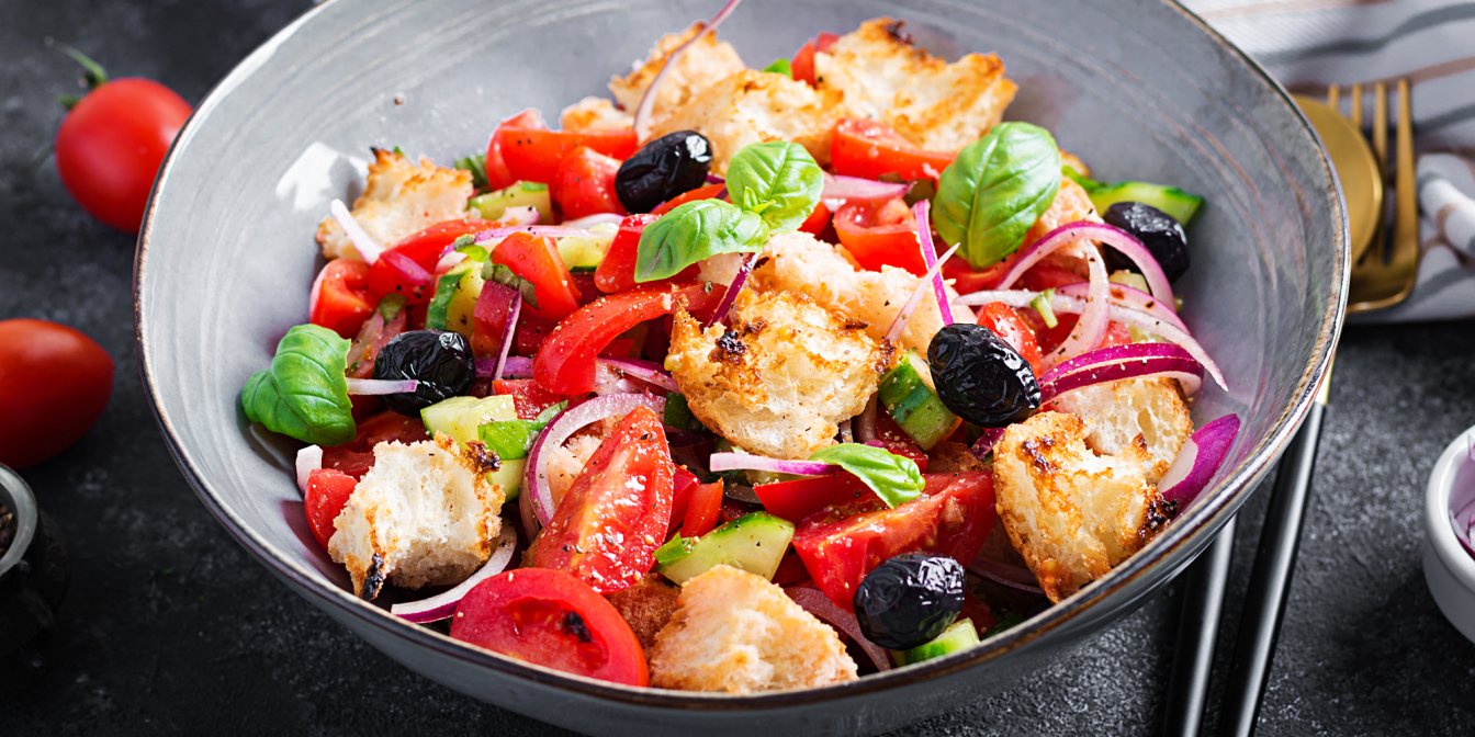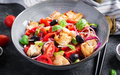 Славетний італійський салат панцанела має багато варіацій, але три складники незмінні — хліб, помідори та оливкова олія. Скористаймося сезоном томатів і приготуймо легку панцанелу з куркою на вечерю. Звісно, наш салат міститиме найзапашніші помідори та найароматнішу оливкову олію.