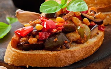 Подавайте теплу капонату, прикрашену листям базиліку та кедровими горішками, з брускетою збоку.