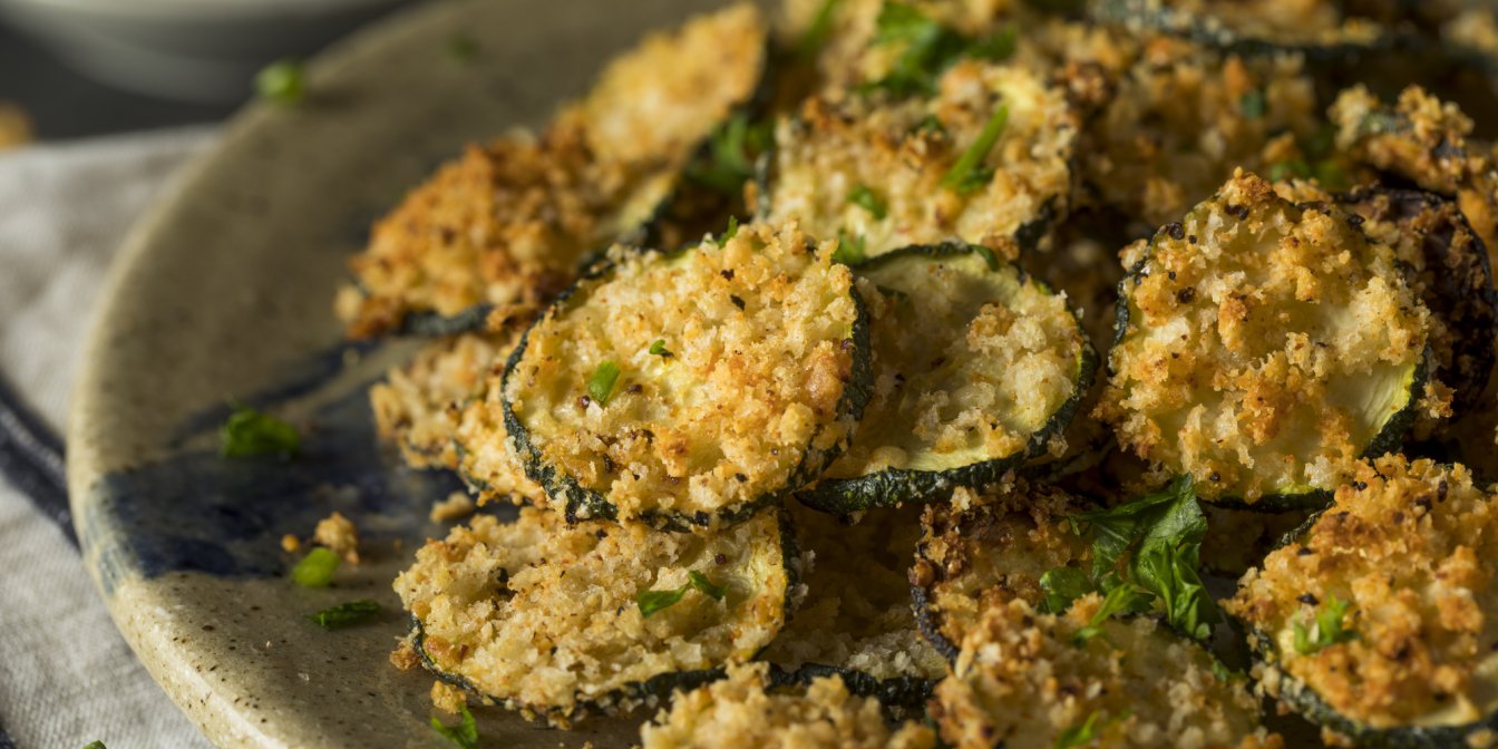 Для приготування корисних овочевих чипсів вам знадобиться цукіні, спеції, оливкова олія, панірувальні сухарі й пармезан. Ніякого смаження у жирному фритюрі — чіпси з цукіні випікаються в духовці. Виходить ну дуже смачно!