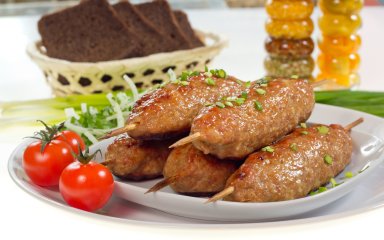З фаршу сформуйте подовгасті котлетки, обережно нанизуйте їх на дерев’яні шпажки. У форму з бортиками налийте трохи води і викладіть котлетки. Запікайте 30 хвилин при температурі 180°C.