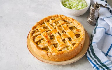 Збийте жовток (можете додати ложку води). Змастіть поверхню пирога. Духовку розігрійте до 180°С, поставте пиріг та випікайте протягом 45 хвилин, але в будь-якому випадку до того моменту, коли зубочистка при протиканні тіста буде залишатися сухою.