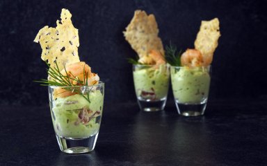 Коктейльний салат, поданий у келихах, з яких стирчать хвостики креветок, незмінно викликає захоплення гостей. Склад салату теж нікого не залишить байдужим, адже під креветками в ньому ховається квашена капуста у хмільному шампанському.