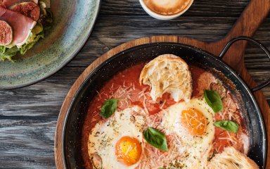 Це не звичайний рецепт яєчні: в оригіналі для нього використовують пармську шинку, ковбаски, капусту кейл і пармезан. Спершу готується соус, а потім яйця з ним запікаються в духовці. Це надзвичайно смачно! Така яєчня по-французьки з ковбасками — для особливого випадку, коли ви хочете пригостити дорогу людину вранці.