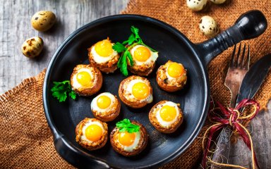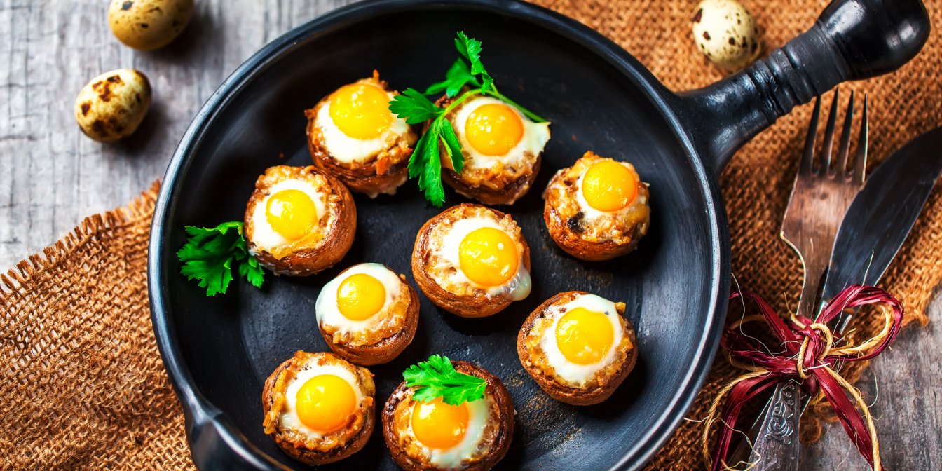 Поєднання грибів та яєць — це класика. Можна запекти їх на грінці, можна запекти у казанку з болгарським перцем, але один з найестетичніших — нафарширувати шапки печериць яйцями та запекти їх у духовці. Виходить низьковуглеводна страва, наповнена білками і клітковиною.