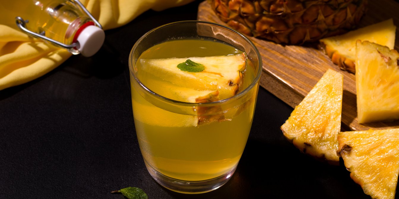Зверху долийте газовану воду та прикрасьте шматочками ананаса.