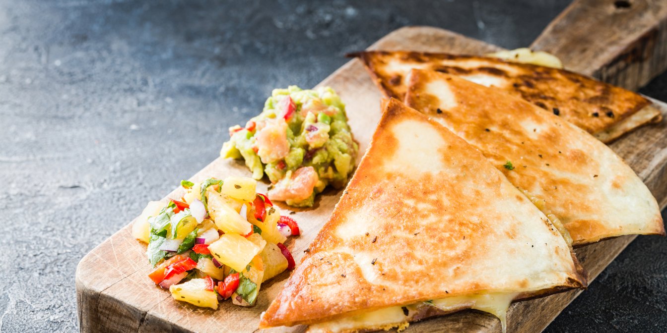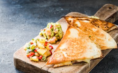 Ця кесадилья досить оригінальна, адже ми більше звикли до мʼясних варіацій цієї страви — наприклад, кесадильї з куркою і сиром. Проте, для любителів риби є гарна новина — кесадилья чудово смакує і з копченим лососем! Вона дуже швидко готується, складається не тільки з рибки, а й із ніжного гуакамоле, який чудово доповнює страву. Подавайте кесадилью з лососем разом із сальсою, сметаною і часточками лайма — це поєднання просто неперевершене!