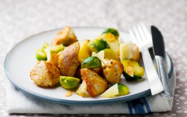 У цій страві поєднуються соковита і ніжна куряча грудка, цибуля, приправи і хрумка брюссельська капуста. Чи може бути ще простіше? Лише три базові інгредієнти, спеції та олія для смаження!