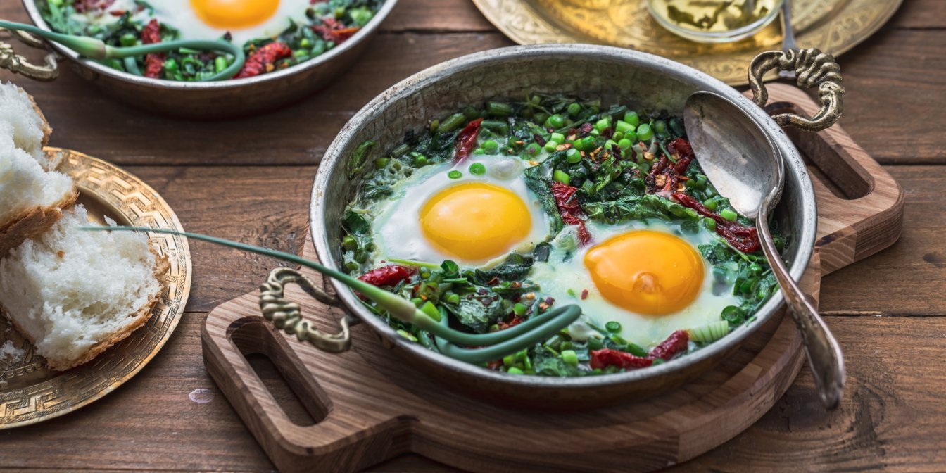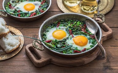 Зелена шакшука — цікава варіація на тему класичної шакшука, в якій замість помідорів — шпинат, зелений горошок та інші зелені овочі. Змішайте свою улюблену зелень, яйця та спеції — ось і все, що потрібно для здорового сніданку.