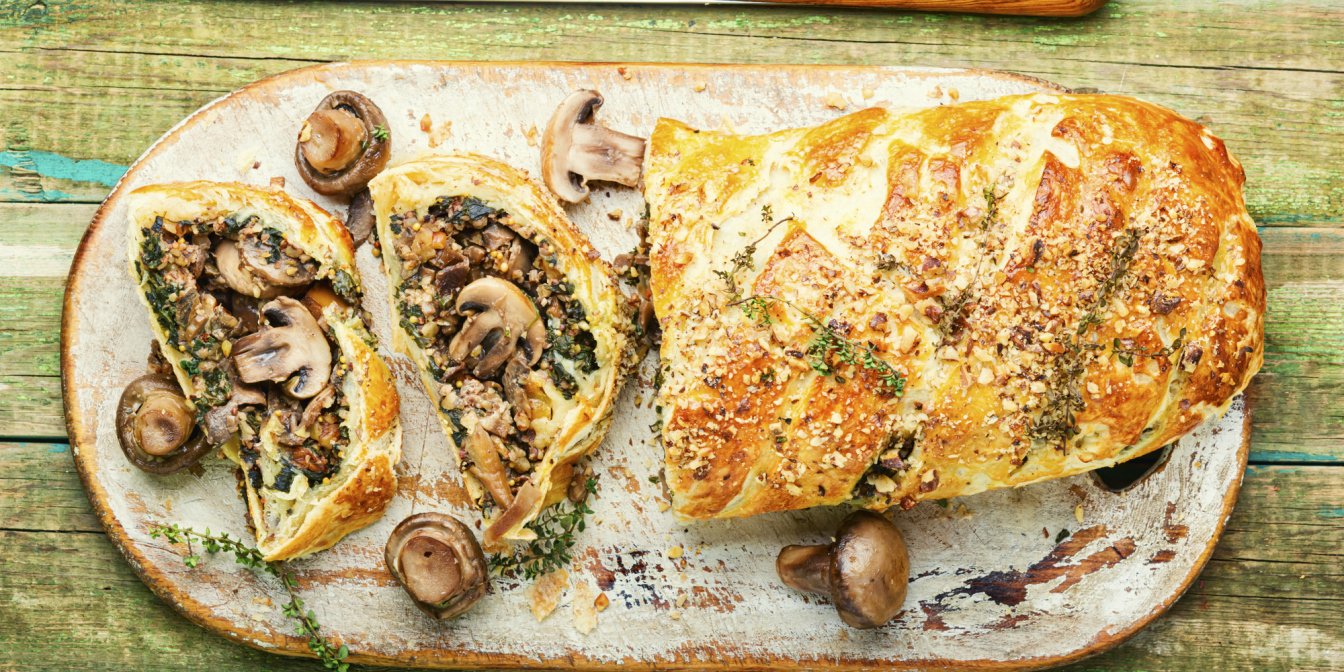 Будьте готові до викриків захоплення, коли ви подасте ці приголомшливі гриби «Веллінгтон» своїй родині та гостям. Ця страва наповнена смачними інгредієнтами, такими як капуста, фарро, батат, гарбуз і гриби. Все це загорнуте в золотаве листкове тісто і подається з легким вершковим соусом.