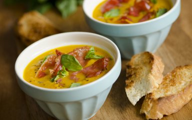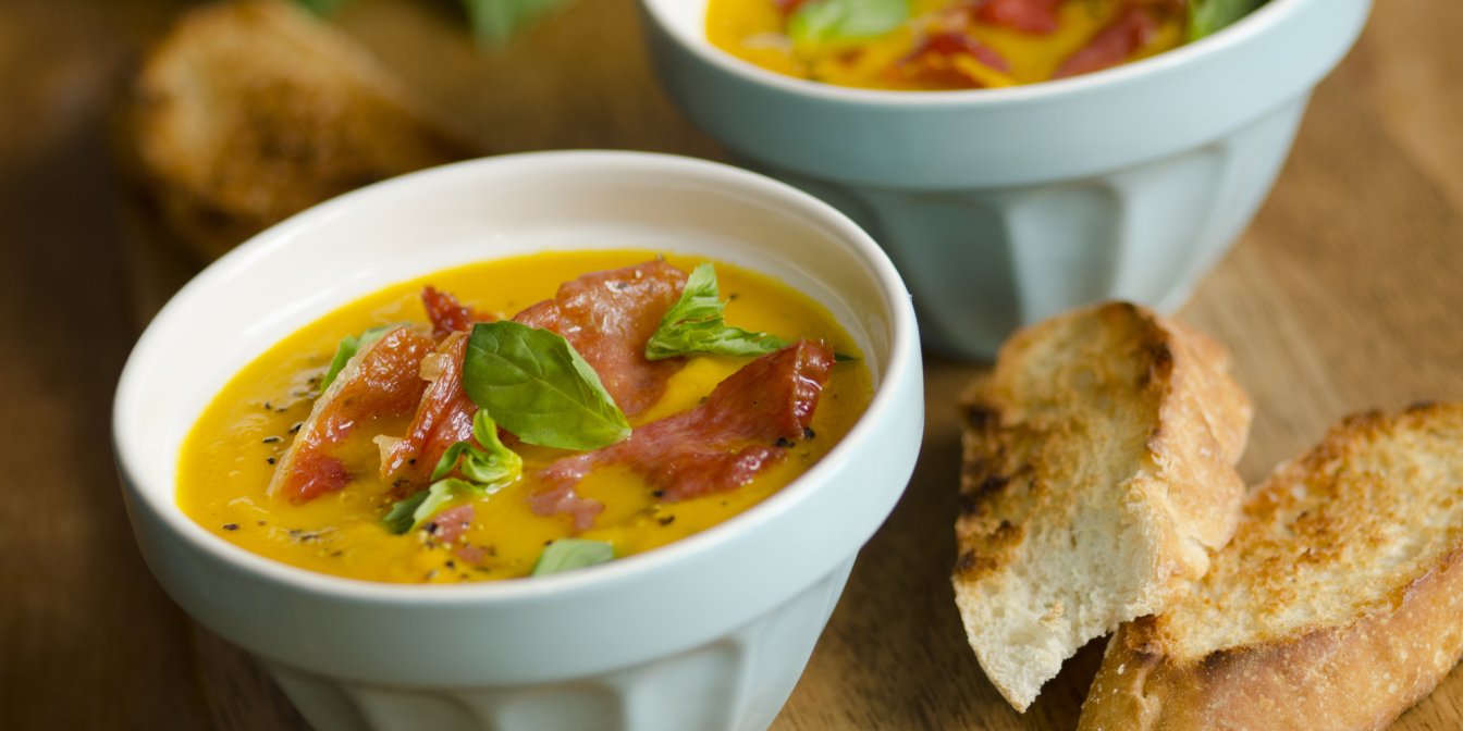 Свіжий суп з королевою серпня динею з прошуто та грінками з білого хліба. Суп-пюре чудово смакуватиме на будь-якому столі, тип паче, що в ньому немає сиру (інколи його не дуже полюбляють у цій страві, як не дивно), немає жирних продуктів.