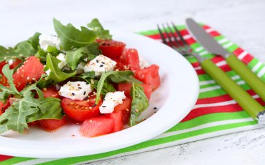Салат з кавуна із додаванням помідорів та м’ятної заправки — це феєрверк смакових відчуттів.