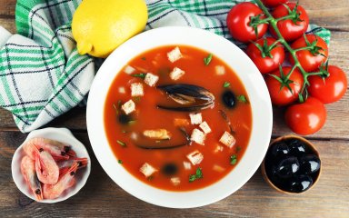 Томатний суп з мідіями можна подати як в якості закуски, так і як основну страву. Обов’язково доповніть його часниковими грінками!