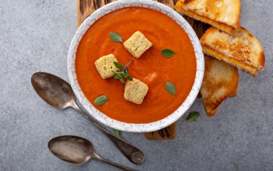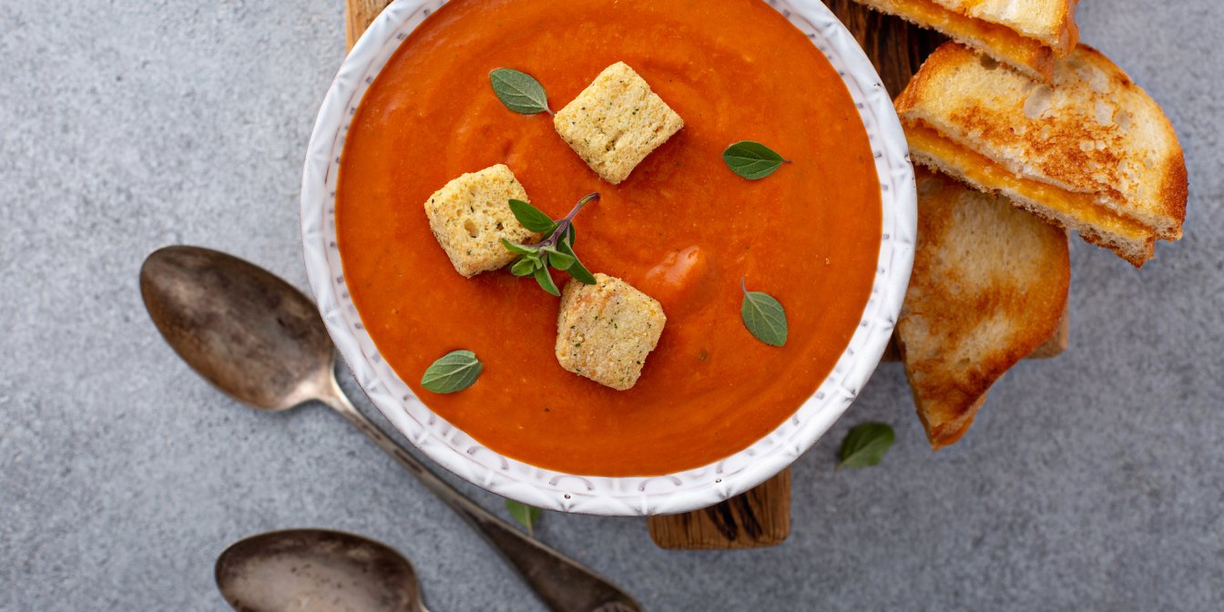 Суп зі смажених помідорів, приправлений часником, свіжим базиліком і пластівцями чилі — це смачна легка вечеря, яку подають з ароматними сирними грінками.