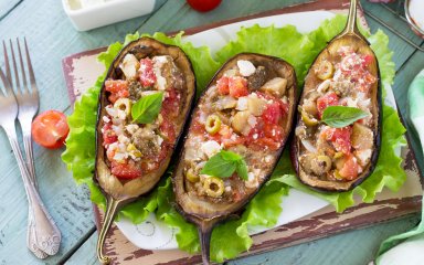 Фаршировані баклажани по-грецьки існують у кількох варіаціях: з начинкою на основі м’ясного фаршу, яєць і фети або з начинкою з баклажанової м’якоті, овочів, оливок і фети. Саме другий варіант ми сьогодні приготуємо!