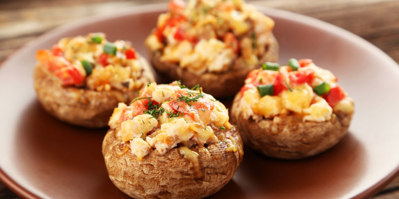 Зазвичай грибні капелюшки з овочами прикрашають фуршетний стіл поруч з іншими закусками — тарталетками з червоною рибою, волованами з курячим філе і грибами, брускетами з томатом тощо. Але ви можете подати їх з легким сезонним салатом на сніданок, обід або вечерю.