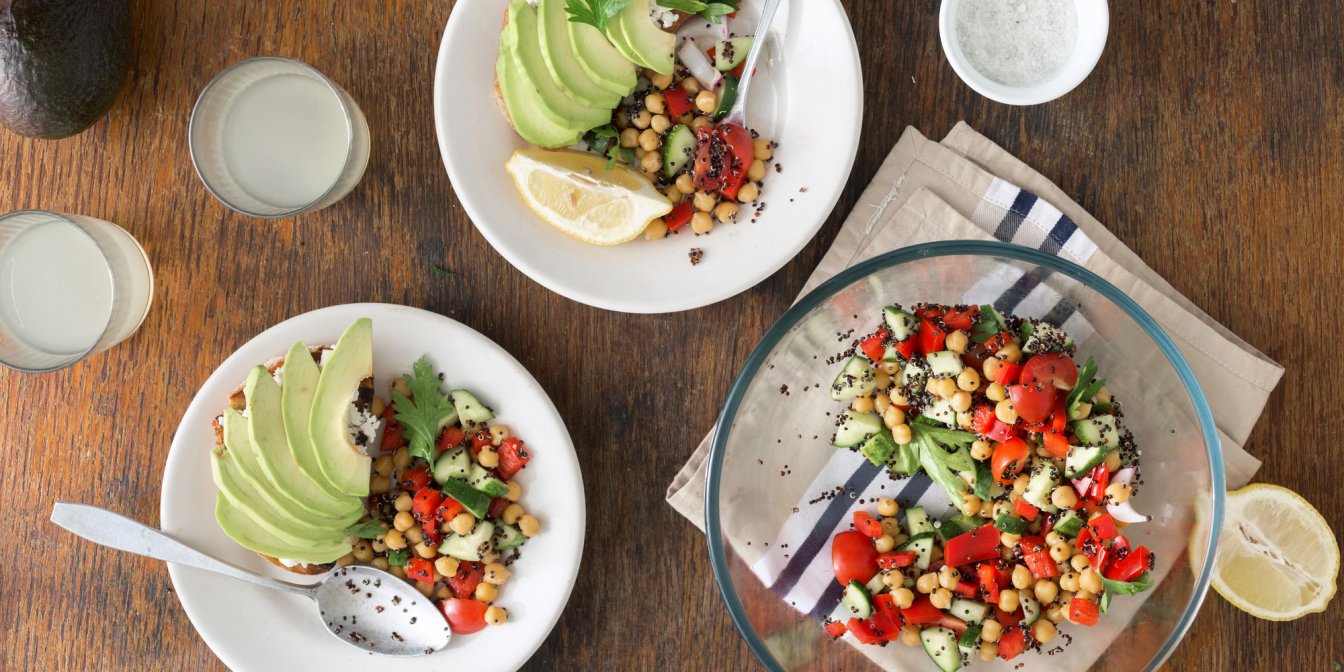 Змішайте кіноа з цибулею, помідорами та нутом у мисці. Добре перемішайте. Зверху викладіть авокадо.