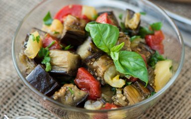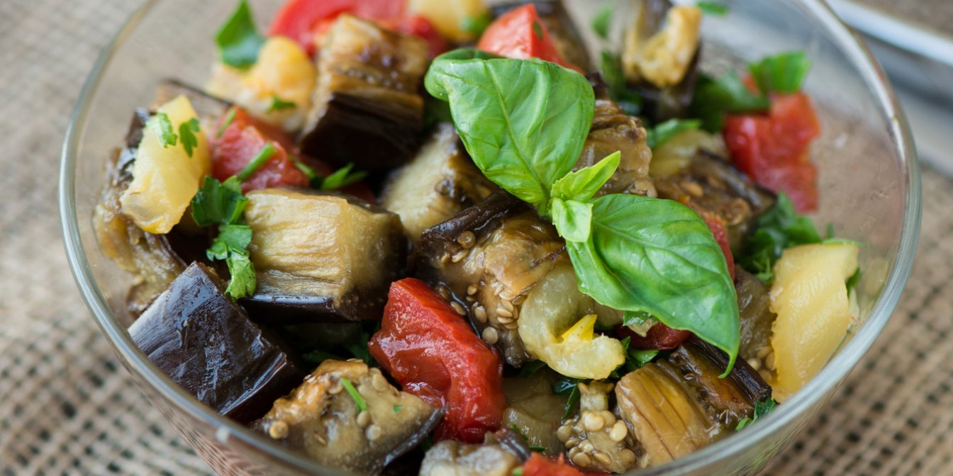 Страва може здатися максимально простою, але насправді це досить особливий салат. І головна його відмінність у тому, що в одній тарілці поєднуються як сирі продукти (помідори, болгарський перець і цибуля), так і термічно оброблені (баклажан і курятина).